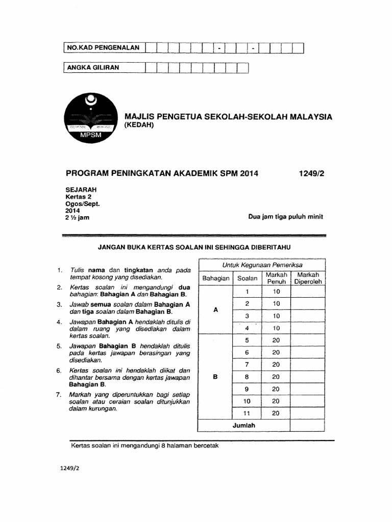 Kenapa bab4 tingkatan5 , tiada. Zatiey_zuwan may 24, 2018 at 2:27 am. Koleksi soalan peperiksaan sebenar spm 2018 dan skema jawapan. Kertas model peperiksaan sbp spm sejarah. Untuk makluman anda, format kertas subjek sejarah terbahagi kepada tiga struktur soalan iaitu kertas 1, kertas 2 dan kertas 3.
